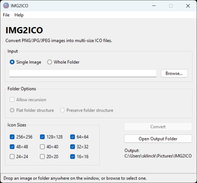 IMG2ICO is a lightweight, easy-to-use Windows desktop app that converts PNG, JPG, and JPEG images into multi-size .ico files in seconds. With a clean interface, simple 3×3 size selection grid, and full drag-and-drop support, it makes creating icons fast and effortless. Just drop in your image, choose your sizes, and convert—your icon is instantly saved to your Pictures folder, ready for use in apps, shortcuts, or branding.