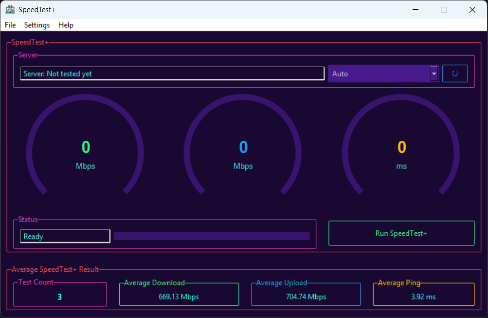 SpeedTest+ is a fast, lightweight Windows desktop application that provides accurate internet speed testing through a clean and modern interface. Built on the official Speedtest CLI, it delivers reliable download, upload, and ping results while offering smart features like server selection, cached server lists to prevent rate limiting, and persistent performance history.